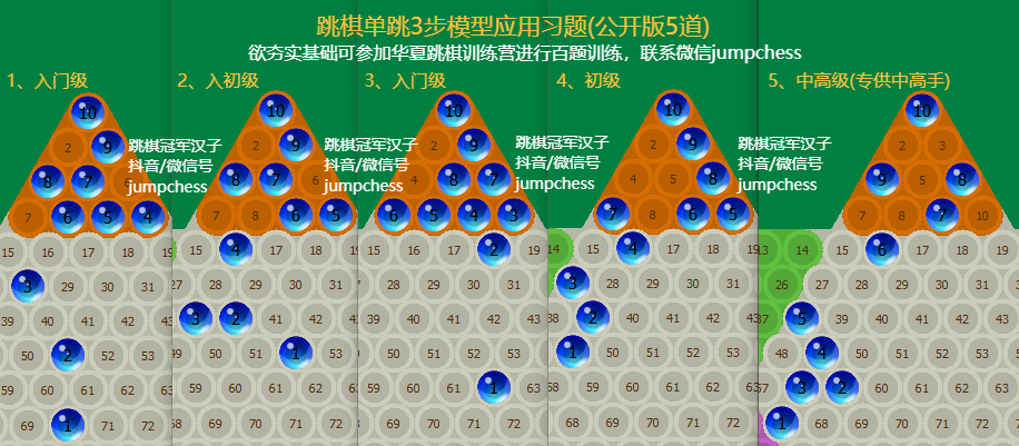 (1)很多棋型和开局是相同原理,可互相推导,这就意味着学习了收局就是学习开局(部分只能娱乐不适用于对付真高手),学习了开局就是学习残局,根据开局等自主命题有没有更多的3步棋型?开局的获取渠道多种多样,如参考《华夏跳棋开局库》、“挑战网”中的录像回放等资料,不是吗?